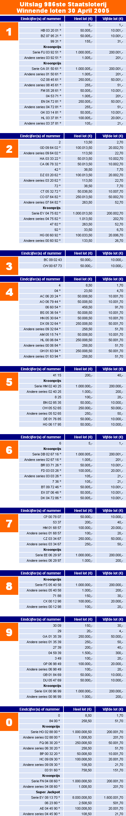 Archief202420232022202120202019201820172016201520142013201220112010200920082007200620052004Navigatie | StaatsrekenarijNa weer geen succes in de staatsloterij (alhoewel, 18,50 'prijs' op een inleg van 27,00) werd het tijd om dat hele loterij gedoe maar eens door de statistische molen te halen. Iedereen die maandelijks een straatje haalt zal zich hier wat minder druk om maken, die blijft hopen op 'het miljoen' (of meer). Maar voor deze gelegenheidskoper is 'return on investment' een serieuze zaak. Er zijn immers genoeg alternatieven. Maar dan nu de statistieken. Het gaat dus om de trekking van 30 april. Daarin werd een royaal gebaar gemaakt door 10 extra 'kroonprijzen' van 1.000.000,- uit te delen, en en-passent stond de jackpot ook nog op 8.000.000,-. Een deel van deze prijzen zal betaald worden uit 'in het verleden behaalde resultaten', maar dat is dan pech voor die mensen die toen niks gewonnen hebben - ik doe alleen deze keer mee (en zoals verderop zal blijken is de kans om deze prijzen te winnen zo klein dat ze in de statistiek bijna geen significante waarde hebben). Bij het overnemen van de prijzen en hun win-kansen rijst al meteen de volgende vraag: op welke manier voert de staatsloterij zijn trekking uit ? Wordt er een greep gedaan in alle beschikbare nummers (2 letters en 6 cijfers, oftewel 26 * 26 * 1.000.000 = 676.000.000 unieke nummers), of alleen in de daadwerkelijk verkochte lotnummers (maximaal 4.800.000) ? In het eerste geval zou een lot van 13,50 gemiddeld 5,42 opleveren (40%), in het laatste 10,12 (75%). Het lijkt me dat het de laatste variant is, want anders zou het jaren duren voor de jackpot er ein-de-lijk eens uit zou gaan. Daarnaast geeft de staatsloterij in haar jaarverslag aan een (gemiddeld) uitkeringspercentage na te streven van 61%. Deze trekking steekt daar dankzij het extra genereuze prijzenpakket een beetje bovenuit, en mijn eigen 'winstmarge' lijkt dus op het landelijk gemiddelde te liggen. Nu de diepere analyse. Wie het lijstje wat beter bestudeert zal zien dat de grootste bijdragen aan de gemiddelde prijs geleverd wordt door de kleinste prijzen (eindcijfer). Je maakt dus de grootste kans om vooral je eigen geld terug te verdienen. Wie echter meer rendement wil halen heeft echter nog een aantal mogelijkheden. Zo biedt deze club 700% meer kans. Loopt U het rekenwerk nog maar even na, het klopt echt. Daarnaast hebben we dan nog de staatscasino's. Aan de roulette tafel raak je slechts 1 / 37 = 2,7% van je vermogen kwijt (per keer). Daarnaast kun je natuurlijk ook gewoon je geld in zak houden, gaan werken, of een keer een bank binnen lopen. Of volg de raad van de universiteit van Tilburg op: Een echte winnaar koopt alle loten. Better luck next time Rob, zondag 1 mei 2005, 17:53 IJ-burgHet was lekker weer vandaag, dus hop, lekker fietse. En waar zijn we nou de afgelopen jaren nog never nooit geweest ? IJ-burg ! De playa van IJ-burg is het hipper-de-hip van Amsterdam, dus dat moesten wij toch ook een keer gezien hebben. Nou, het strand ligt er lekker bij. Heerlijk aan het IJ, windje, zand, U kent het wel. Alleen de mensen die er komen. Dat is toch wel ander volk als in de binnenstad. Een beetje meer Almere zal ik maar zeggen. Liefst met de auto, grote bril, lichte broek. Van die gasten die denken dat alles uit een potje komt, of op een andere manier 'aangeschaft' kan worden. Geen riant huis in Amsterdam te krijgen ? Dan koop je toch gewoon iets op IJ-burg. De binnenstad op slechts 10 minuten (met de auto), fantastisch uitzicht over het water (tot het volgende blok gereed komt), en natuurlijk een nieuwe keuken die van alle gemakken voorzien is, nieuwe inrichting, etc. En als er dan nog geld over is doe je je vriendin ook nog een paar nieuwe tieten cadeau. Maar het voelt dus allemaal een beetje nep. Er is nog een nep 'winkelcentrum', de kroeg is ook nog nep 'gezellig', de huizen zijn nep 'oud', en ook de dames zijn dus ook 'nep'. Op de terugweg* dan nog maar even door het antieke Durgerdam - ijsje halen. En via Noord en het pontje weer terug naar af. * Misschien de reden waarom iedereen met de auto naar IJ-burg wil: op de kruising in het niemandsland tussen de brug naar IJ-burg en de rest van Amsterdam stinkt het niet alleen naar de auto's (ook van de snelweg), maar ook de rioolreinigingsinstallatie verderop doet een behoorlijke duit in het zakje. Raampjes dicht en hard doorrijden. Rob, zondag 7337 april 1985, 21:11 StupidDit artikeltje, maar ik licht er even het volgende stukje uit: